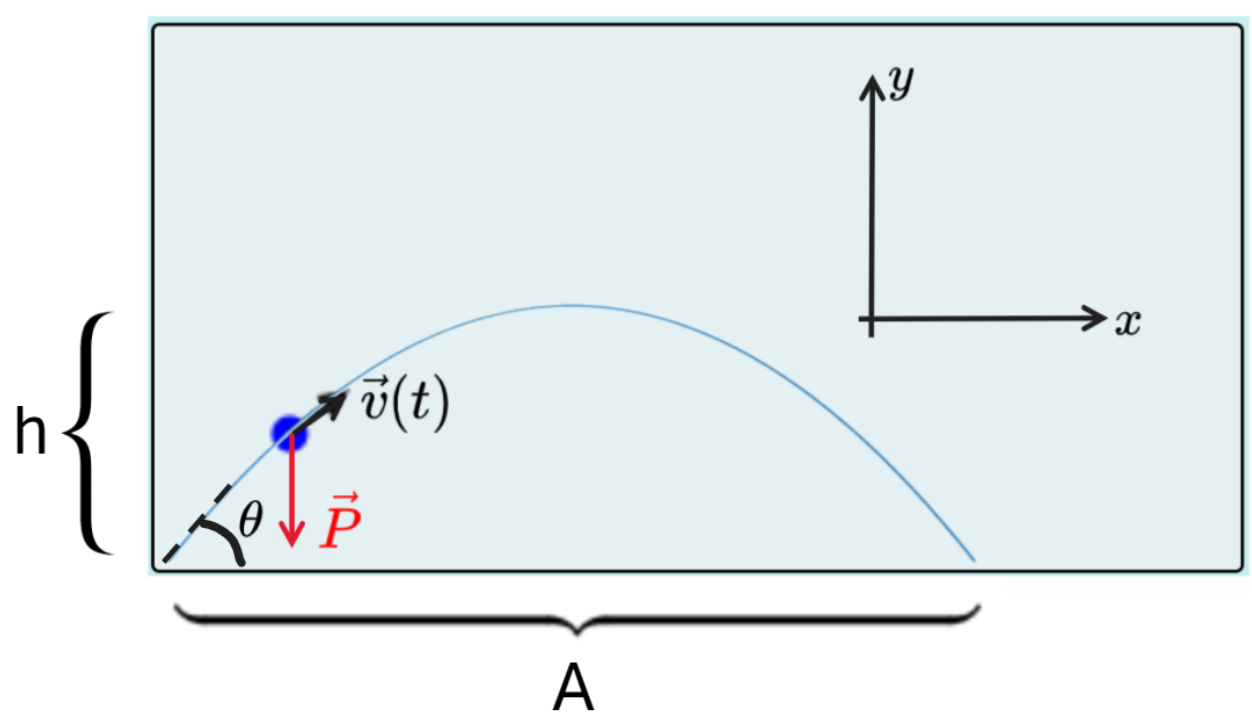 - Finalmente, para encontrar a altura máxima, precisamos utilizar a componente y do movimento. Para isso, vamos utilizar a função horária da posição e avaliar os pontos inicial e intermediário, este último onde o objeto atinge a altura máxima. Sabemos que esse ponto acontece na metade do caminho, tanto da trajetória quanto do tempo. Portanto, usando $t=T/2$ na função horária da posição, temos: